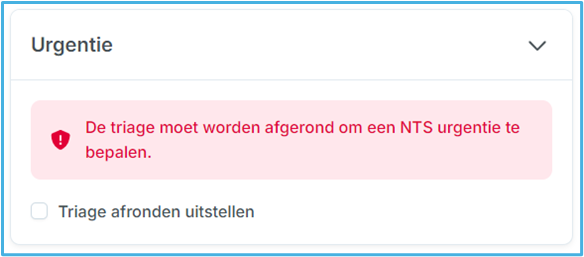 De optie om een call af te ronden zonder volledige triage is beschikbaar. Wanneer je een call niet wil afronden maar wel verder wil werken in de flow kun je in de card 'Urgentie' op het tabblad 'vervolgacties' aangeven dat je de triage wil overslaan door een vinkje te plaatsen bij 'Triage afronden uitstellen'. Vervolgens kan de triagistenflow worden afgerond en komt de call op de werklijst zodat de triage op een later moment kan worden afgerond.