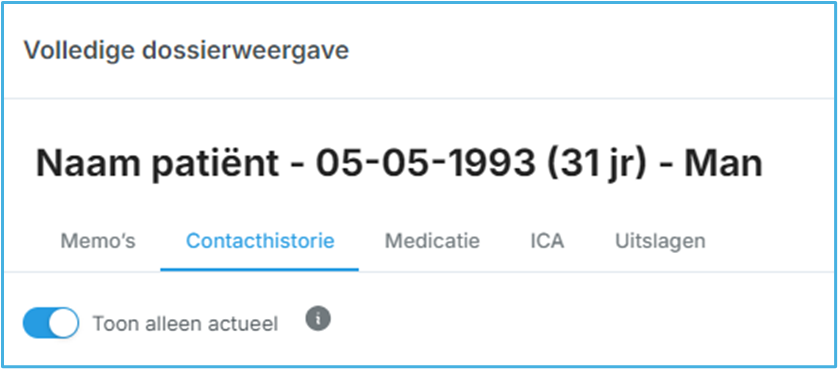 Zowel in het side panel als in de volledige dossierweergave hebben we een toggle toegevoegd om te kunnen filteren op het actuele dossier.
