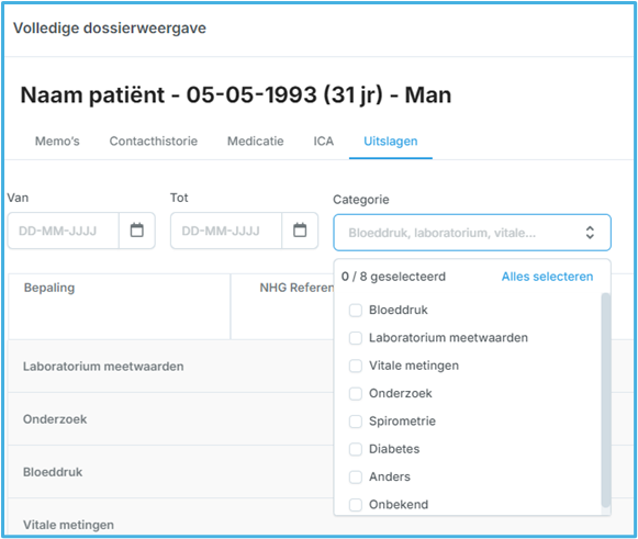 We hebben aan de volledige dossierweergave het tabblad uitslagen toegevoegd. Hierop zijn alle meetwaardes die bekend zijn in te zien. |