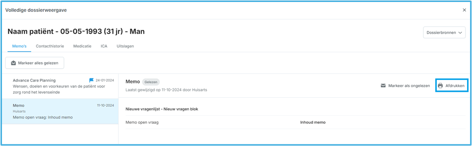 Het afdrukken van memo's en ACP zijn van deze release ook mogelijk in de triagistenflow. Wanneer je kiest voor afdrukken krijg je niet eerst een samenvatting te zien maar kom je meteen in het printmenu. Daar zal wel de samenvatting getoond worden maar is het mogelijk om meteen af te drukken.