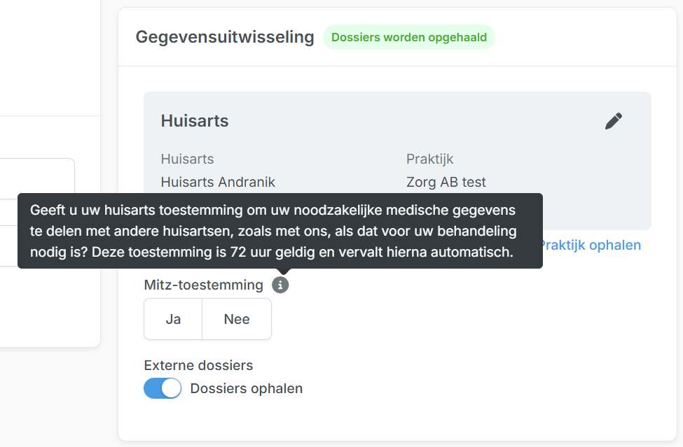 Geeft u uw huisarts toestemming om uw noodzakelijke medische gegevens beschikbaar te stellen aan andere huisartsen, zoals met ons, als dat voor uw behandeling nodig is? Deze toestemming is 72 uur geldig en vervalt hierna automatisch.