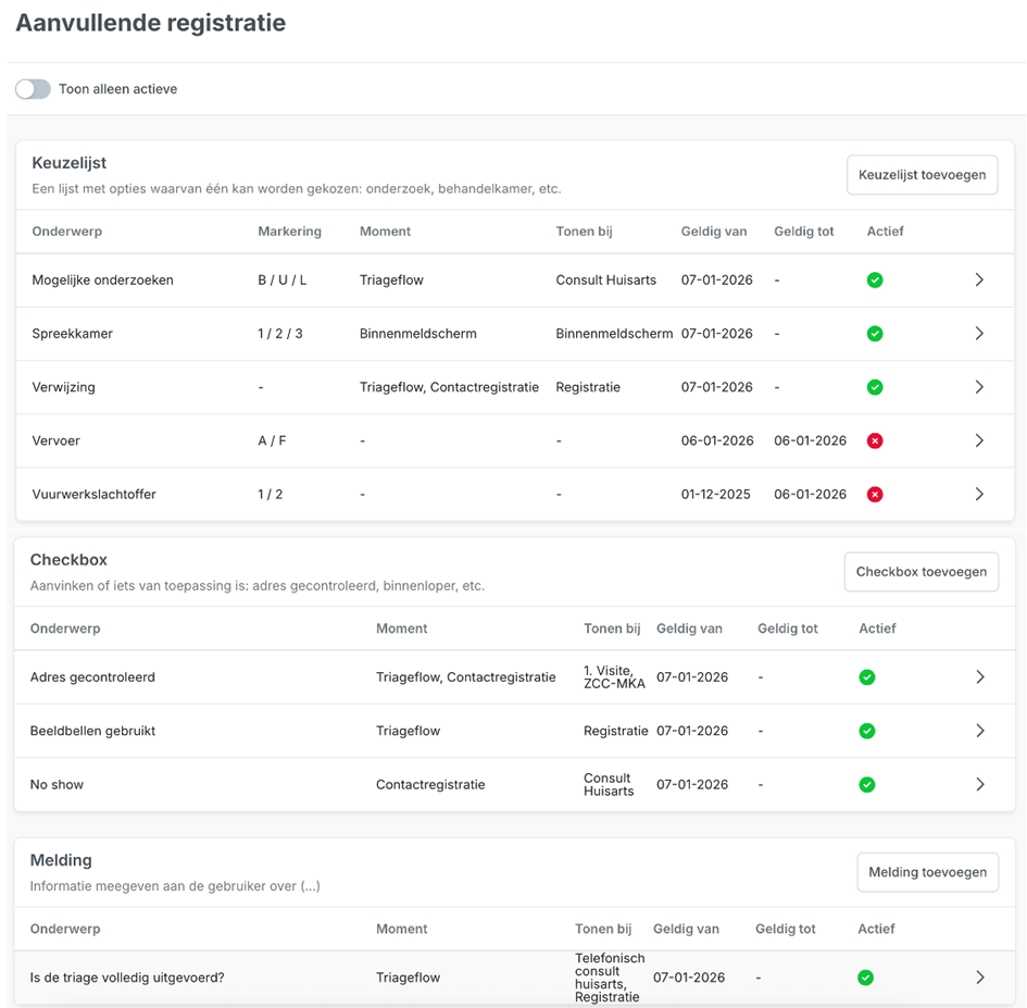 Er zijn 3 type Aanvullende registraties. Deze kunnen op verschillende plekken in het proces (triage, NAW, contactregistratie, binnenmelden) en op het scherm (in de cards), worden getoond: