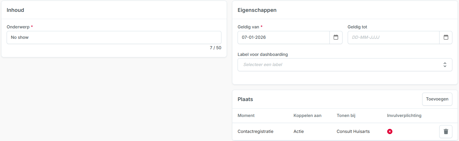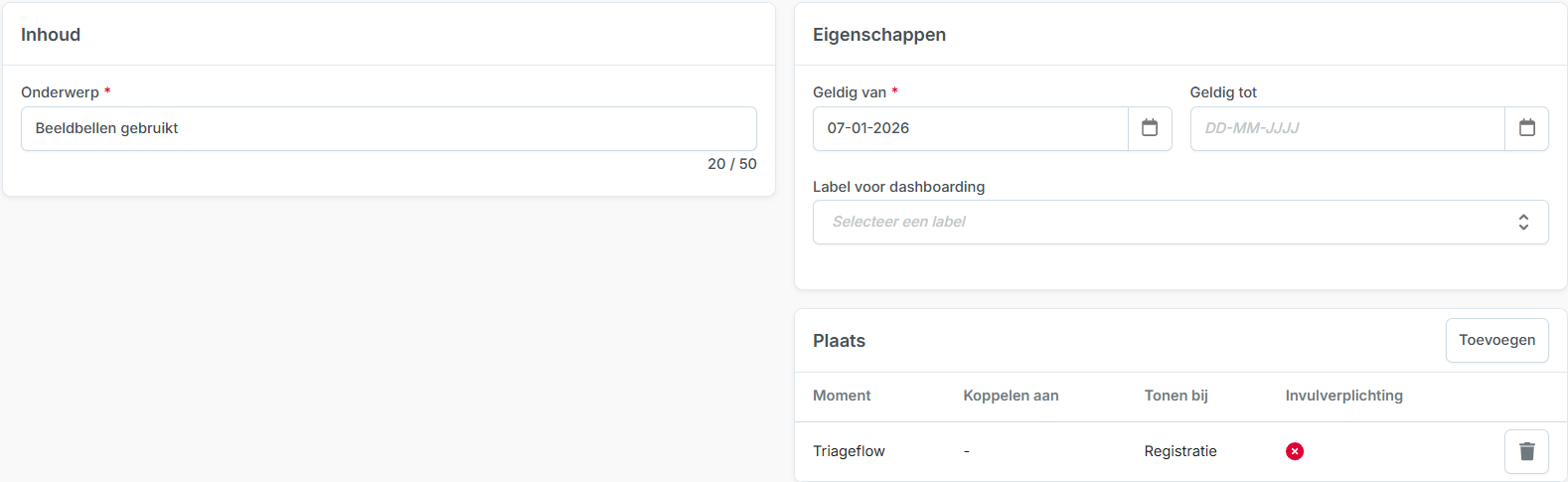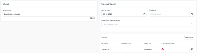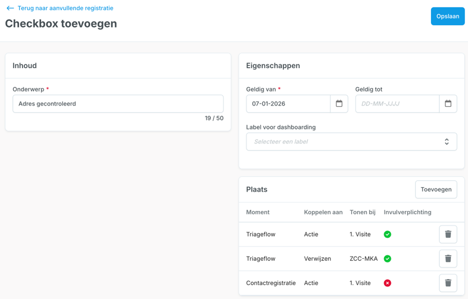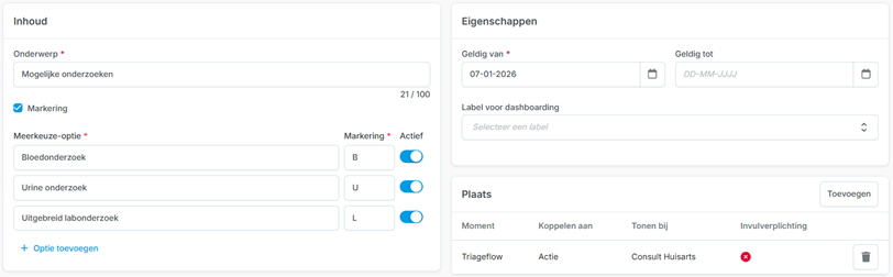 - Het veld ‘Label voor dashboarding’ geeft op dit moment nog geen opties. Deze kunnen later worden ingericht in overleg tussen klant, consultant en Topicus.