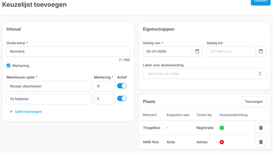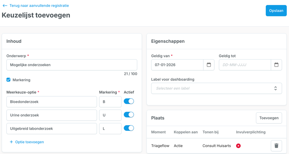 Klik Toevoegen om een Keuzelijst, Checkbox of Melding toe te voegen. In het voorbeeld hieronder wordt het detailscherm Keuzelijst toevoegen getoond.