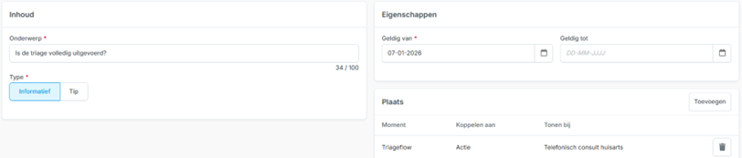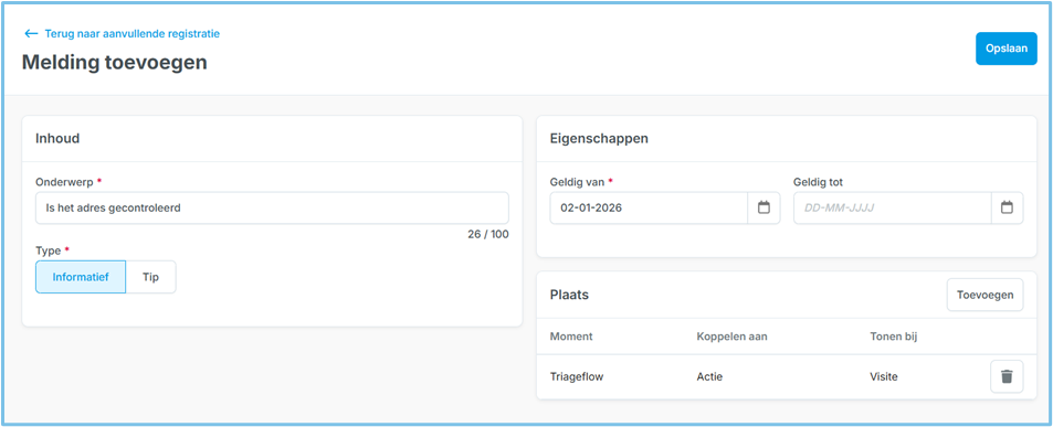 Op het detailscherm Melding toevoegen kan een Informatieve of Tip-melding worden gekozen. Er is geen “Label voor dashboarding”.