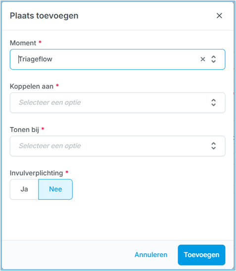 Kies aan welk proces de Aanvullende registratie gekoppeld wordt: ANW, Triageflow, Contactregistratie, Binnenmelden scherm.