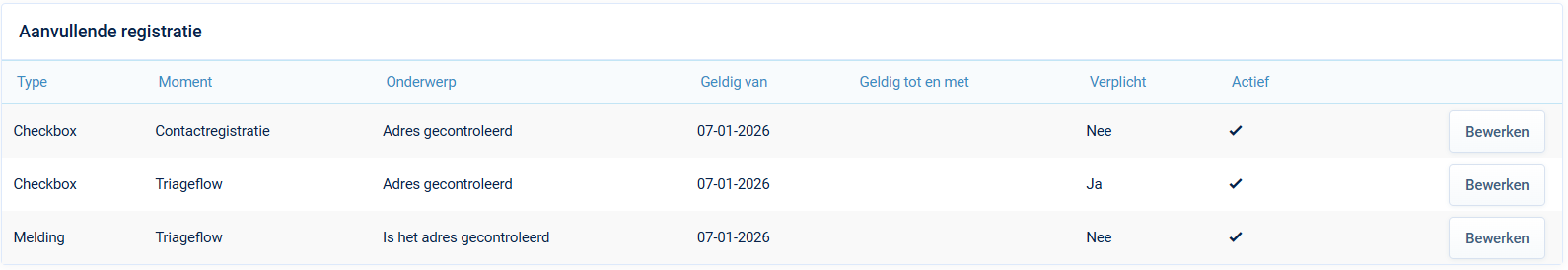 In actie/statusbeheer en organisatiebeheer worden de gekoppelde registraties getoond met een knop ‘bewerken’. Wanneer je hierop klikt wordt je doorgestuurd naar ‘Aanvullende registratie’.
