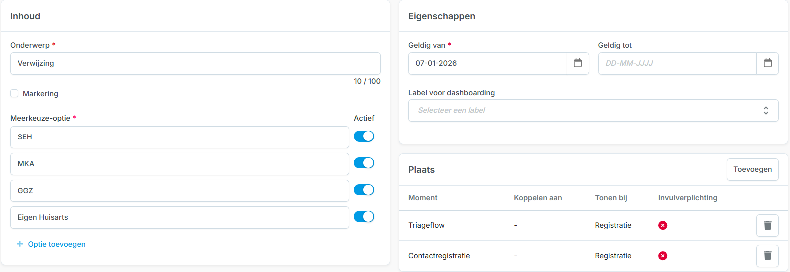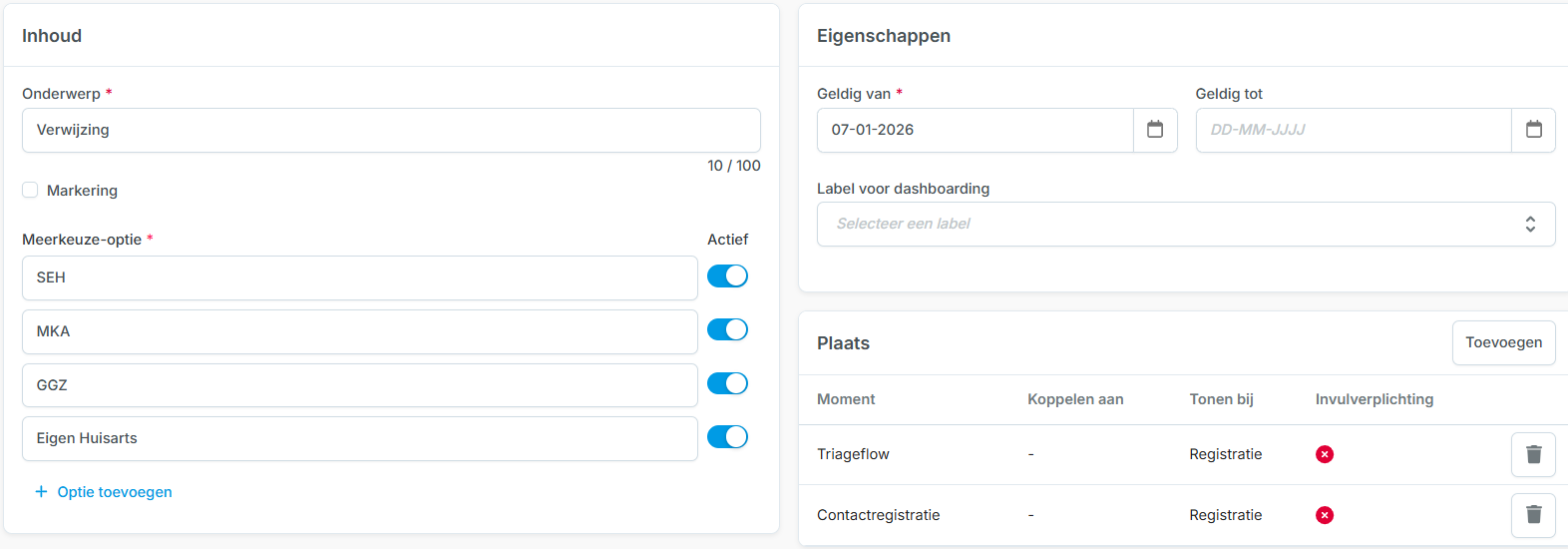 | Meerkeuze-optie* | Vul hier de antwoorden die passen bij het onderwerp in. Standaard is het antwoord ‘actief’; Inactiveer via het schuifje als het antwoord niet meer getoond moet worden. |