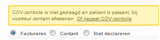 - In een aantal situaties doet de applicatie een voorstel dat wellicht beter contant afgerekend kan worden (bijv. bij een patiënt waar de COV is gefaald).